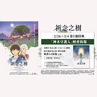 今天(2/26日 週四)起上映的《祈念之樹》,電影票乙張可以在原購票影城兌換首周(2/26-3/4)特典「檀香A3海報」乙張,海報在接觸人的手指體溫後會散發淡淡檀香味,領取時間與方式,請依照各影城官網與現場公告,數量有限,送完為止。